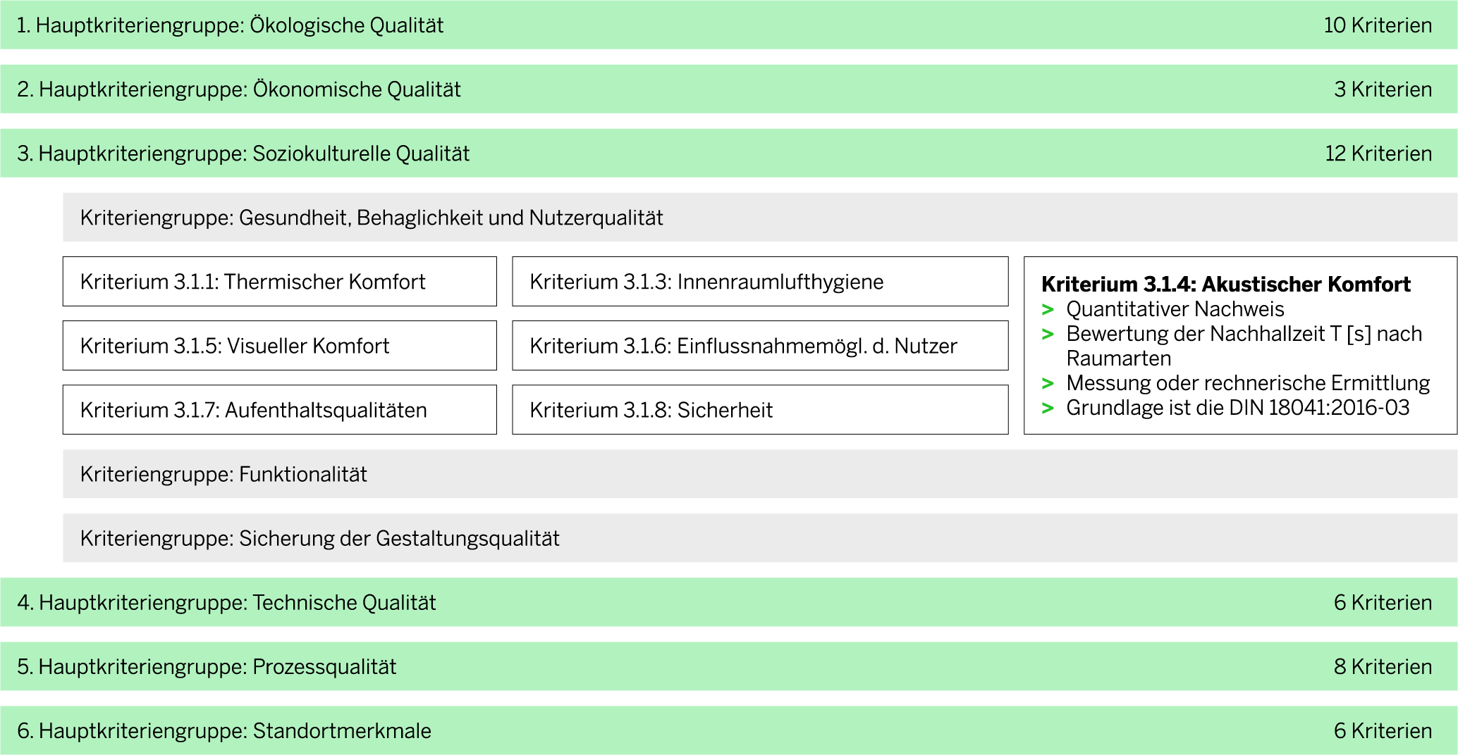 die Kriteriengruppen und die Kriterien. Die Kriterien bilden jeweils einen eigenen Nachweis und werden anhand von Steckbriefen definiert. Abhängig vom Erfüllungsgrad erhält ein Projekt bei Abschluss die Auszeichnung Bronze, Silber oder Gold.