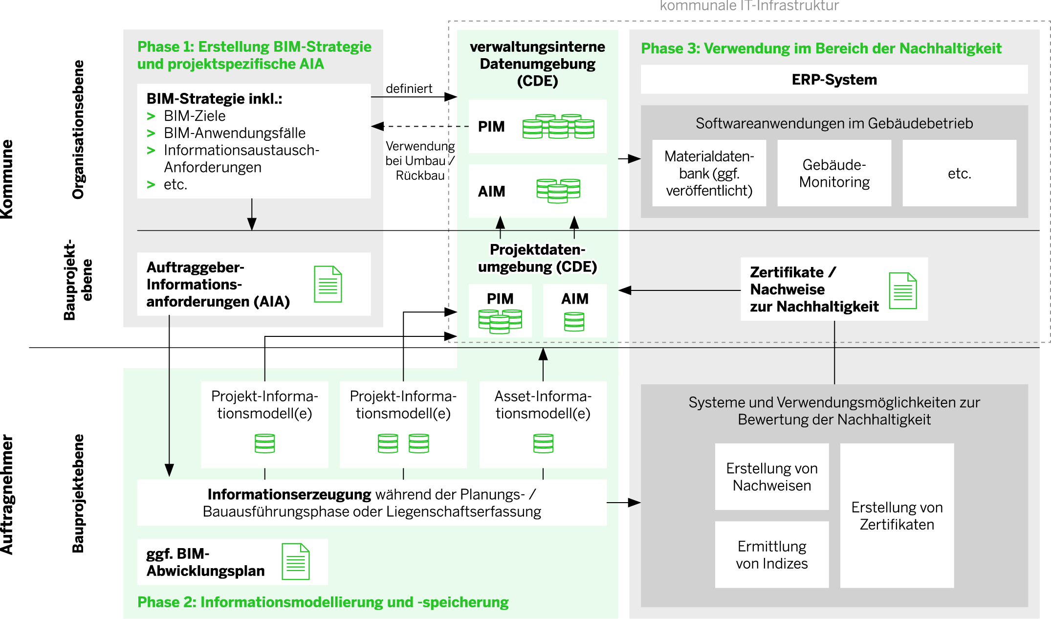 Im Rahmen der BIM-Strategie werden die Ziele und Anforderungen zur Umsetzung eines nachhaltigen und ressourcenschonenden Prozesses (Planen, Bauen, Betreiben, Rückbauen) definiert.